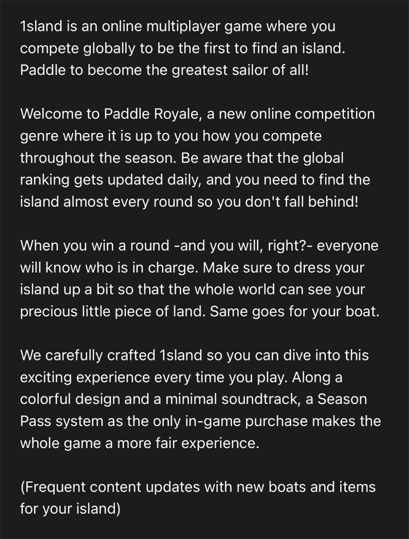 1sland is a unique, minimalist game centered around a playful “paddle royale” mechanic, where players compete globally to be the first sailor to find an island. While this game has excellent visuals and fun gameplay, they suffer from flaws of invisibility when it comes to App Store Optimization. With a few tweaks to the listing, 1sland could find its way to many more players around the globe, and set sail to the top of the charts.