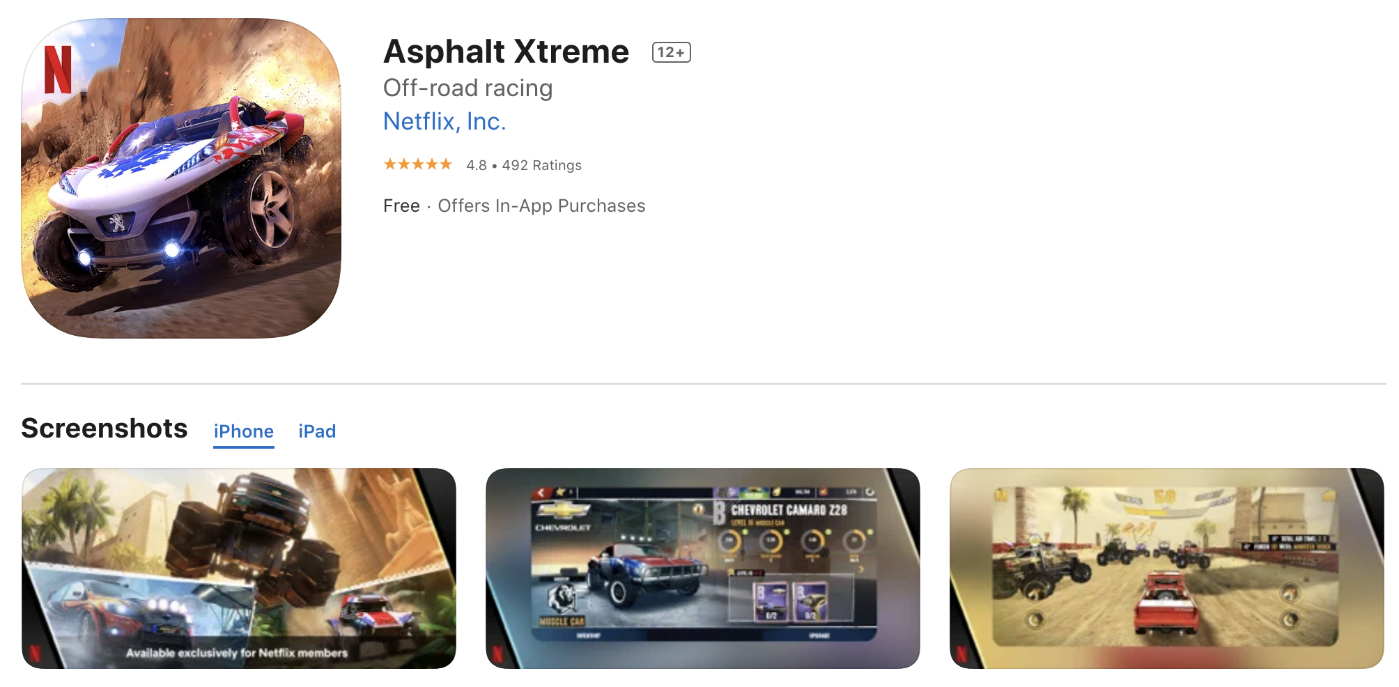 The app description is only 1,149 characters out of 4,000 available, and while it communicates the features briefly, there is a lack of compelling introduction and value propositioning. The screenshots contain high-quality in-app images, but lack any type of screenshot copy on the iPhone, and have very little, repetitive copy on the iPad. Behind the scenes, Netflix’s game is ranking for 57 keywords and phrases, with only eight ranking in the top 10, and only 30 are highly searched terms. While Asphalt Xtreme has been highly rated by the users who have discovered it, this lack of keyword footprint could prevent the game from finding even more happy players.