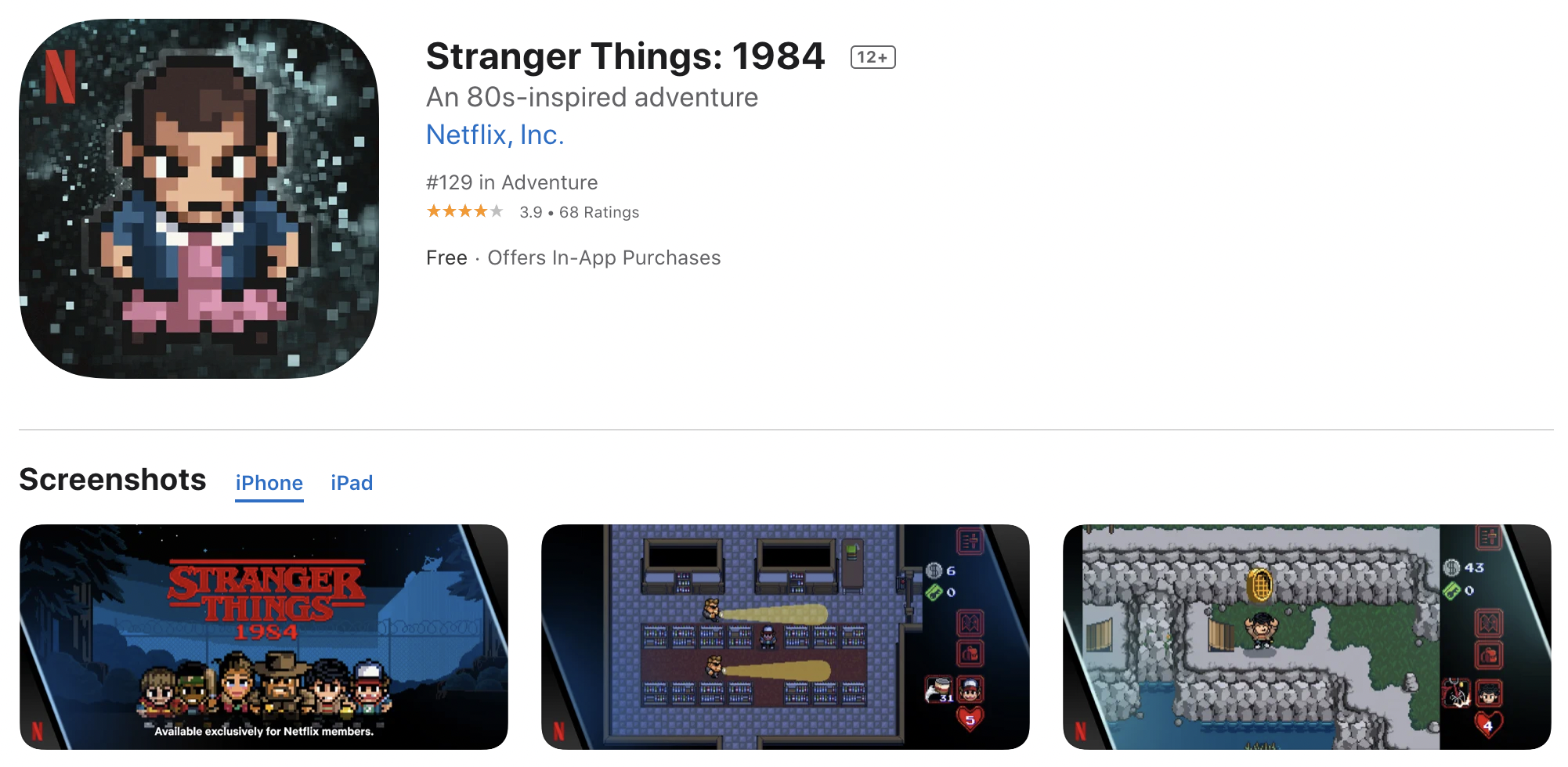 Stranger Things: 1984 suffers from many of the same missed keyword opportunities as Netflix's other games. Where they went right was including “adventure” in the subtitle “An 80s-inspired adventure”, which contributes to phrases surrounding adventure games. Stranger Things: 1984 ranks #129 in the Adventure Game category. The description is a single feature list just over 700 characters long, and just like Netflix's other Stranger Things title, the screenshots are beautiful in-game art with no descriptive text. Stranger Things: 1984 is ranking for 91 keywords and phrases, with eight of them ranked in the top 10 and 47 popular search terms.