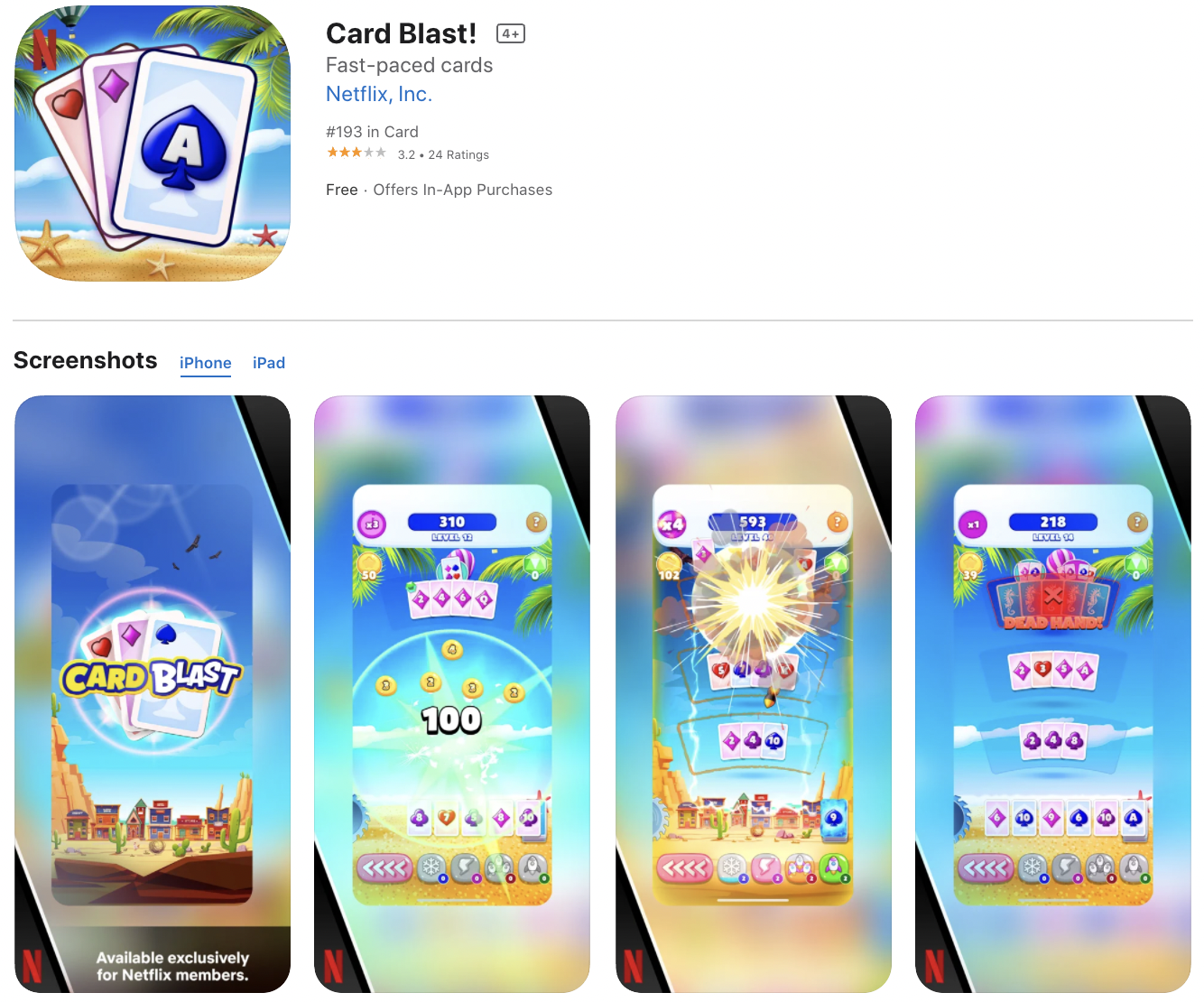 Card Blast! is Netflix's puzzle card game, where users must combine their problem solving skills with luck. Standing at 3.2 stars and only 24 ratings indicates that this app may not be getting discovered by new users, despite ranking number 193 in the Card Game category. The title does not contain any title tags, which leaves it sitting at only 11 characters out of 30, and the 16-character subtitle “Fast-Paced Cards” can be improved with the right keywords. Similar to Netflix's other titles, the description is rather lacking, with only a few sentences that vaguely describe the gameplay. The screenshots show gameplay imagery however, without any copy, it is difficult to discern what how the game actually functions. Card Blast! ranks for 68 phrases and keywords, but none of these are ranking in the top 10, and only 39 are frequently searched.