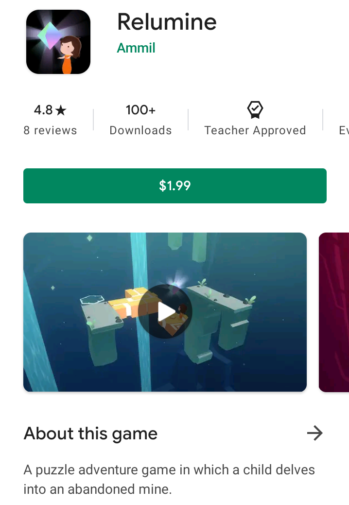 On the Google Play Store, the Short Description is better both because it is actually being utilized and due to keyword choice. Relumine’s Short Description, “A puzzle adventure game in which a child delves into an abandoned mine.”, utilizes 71 of the available 80 characters, which is a great start. Further into the Short Description the keyword choices get weaker, but starting off with “puzzle,” “adventure,” and “game” sets the stage for great indexation.