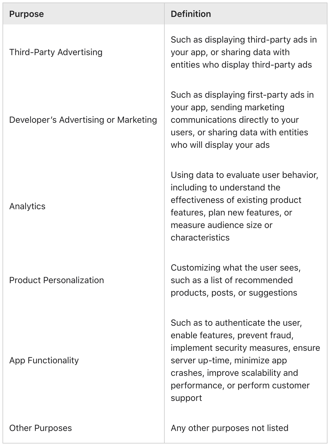 • Other definitions and guidelines pertinent to this new feature, such as data linked to users, tracking capabilities and the differences between a “privacy policy” URL and a “privacy choice” URL