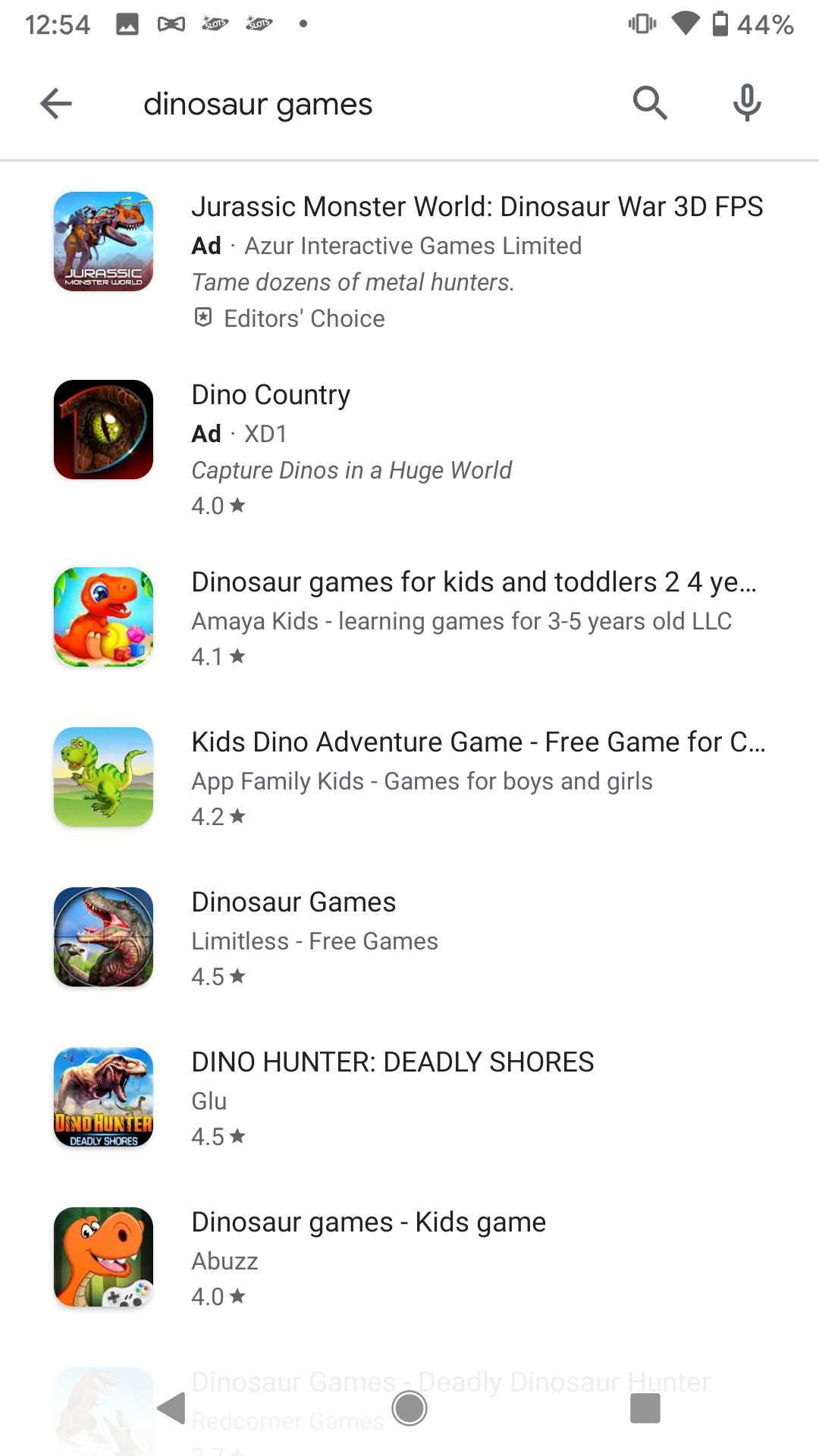 Mobile games often use their brand logo or characters to represent their apps. This is particularly common with games or apps based on specific shows or movies. As an example, a search for “dinosaur games” comes back with several apps featuring similar design styles, each presented differently. They typically feature a single dinosaur (usually a tyrannosaurus rex) in the art style of the game.