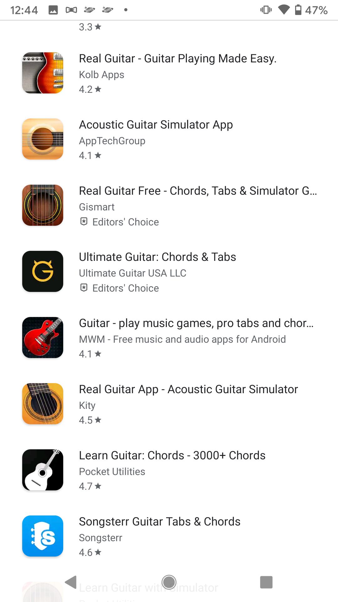 For instance, a search for "guitar" shows that most of the top apps for that term feature a guitar prominently on their icons. These create visual cues that represent the app’s functionality. At the same time, each one presents a different identity in the way the icon uses the guitar and other visual elements.