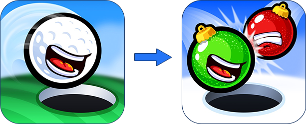 Golf Blitz has changed its smiling Golf Ball icon into two battling Christmas ornaments, highlighting its player-versus-player gameplay. The “green” has also changed to a snowy white.