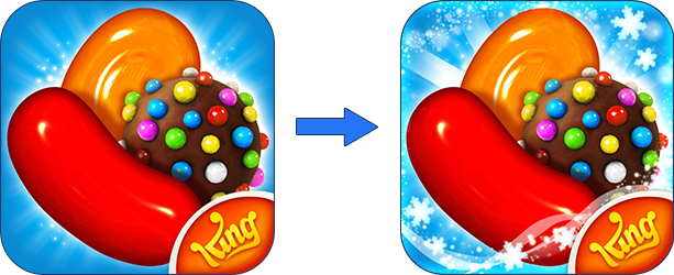 Candy Crush Saga incorporates mostly the same icon: the same game pieces, the same color overall. Subtle yet noticeable snowflakes naturally compliment the already sky-blue background.