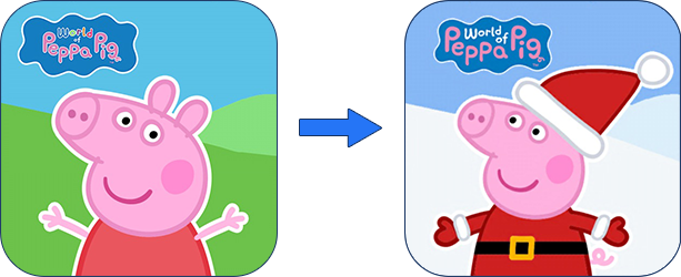 Whether designed for kids, or games for players of all ages, seasonal icons are a common practice among apps in the games category. Peppa is now adorned with a Santa hat, and the environment has changed to a snowy field.
