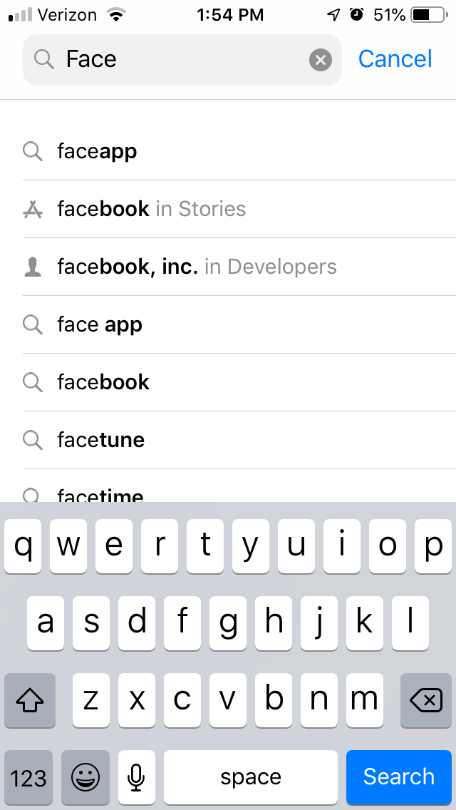 When the user begins typing in their query, the search engine suggests potential keywords or app names that could complete their query. These suggestions can begin from the first letter but get more specific as the user types more. For instance, simply typing “F” will instantly pull up suggestions for “faceapp,” “four go” and “Fortnite,” which can then turn into suggestions for “Facebook” and “Facetime” as the query gets more specific.