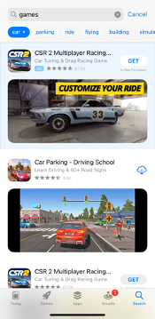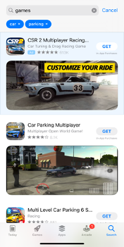 If the user then goes with the search suggestion “car” by tapping on it in the list, Apple further narrows down the suggestion to popular types of car games.