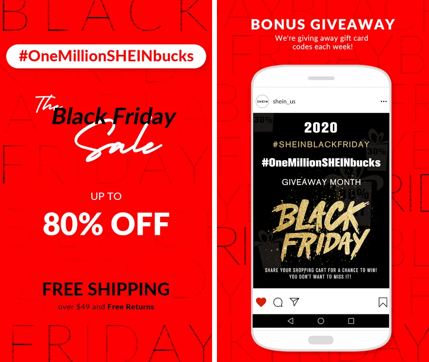 We can see some apps have already updated to highlight Black Friday sales. SHEIN, ranked #2 for “shopping apps” on the Google Play Store, uses its first screenshot to highlight its Black Friday Sale. It also added another Black Friday screenshot further down highlighting a special giveaway it’s holding in November.