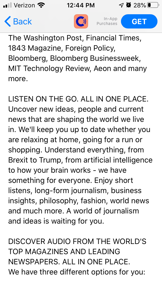 The description uses short lines early on, clearly presenting its purpose. It begins with a general “audio journalism from leading newspapers and magazines” value proposition for a solid value proposition. The app description then brings up current events by providing examples such as Coronavirus news and the Pomodoro Technique.