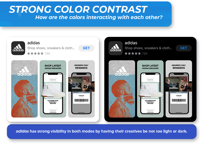 Apple has provided visual design guidelines for developers to keep in mind when building their apps to be displayed in Dark Mode. This is specifically for in-app content, but the advice can be carried through for consideration when designing creative sets for Product Pages. While most of these Dark Mode Visual Design guidelines apply to how apps change when a user selects Light or Dark Mode, some also apply to creative sets: