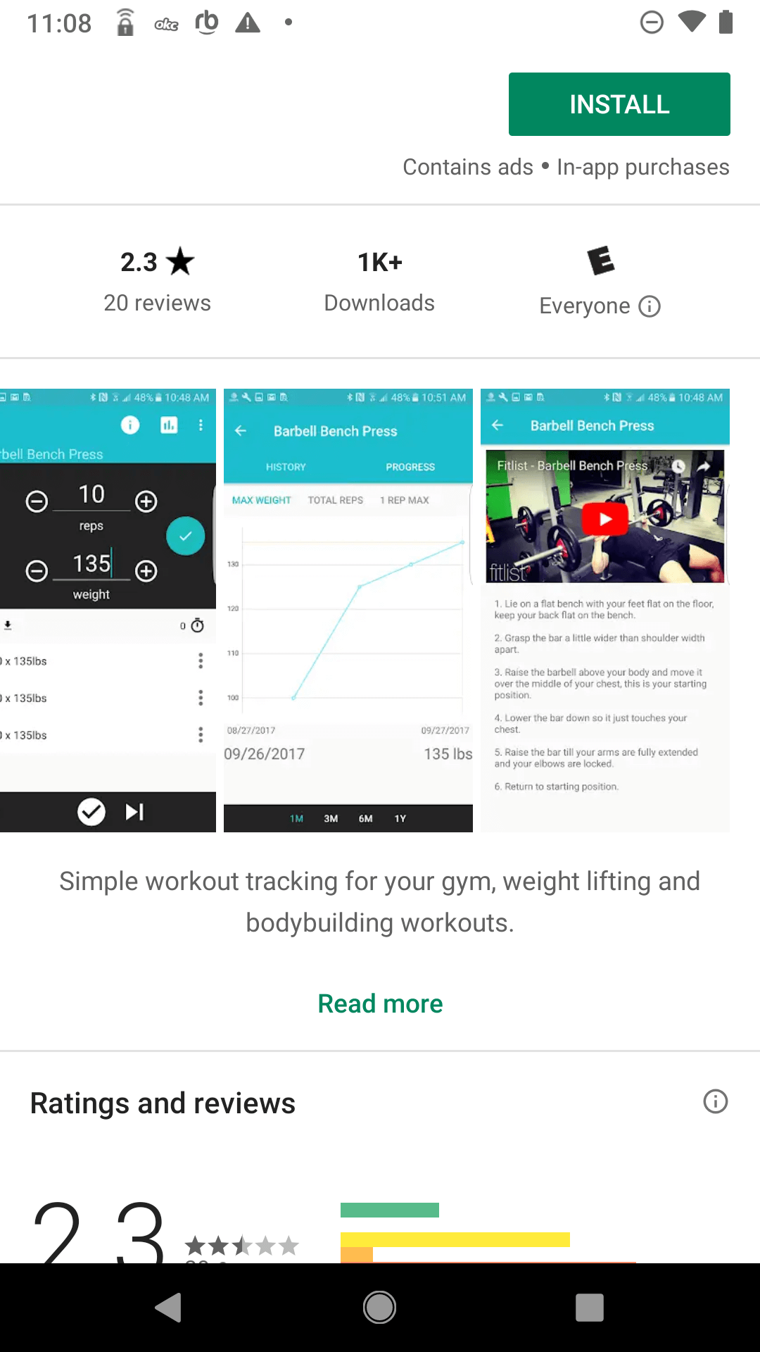 Creatives: Fitlist’s creative set on Google Play appears out of date, featuring four screenshots with no background designs or callout text. While each one does show a different feature of the app and is presented in a way to show users the process of tracking a barbell bench press routine, there is nothing to make them stand out. Without the callout text, they’re presented without context and do not provide users with information about what the app does or its benefits.