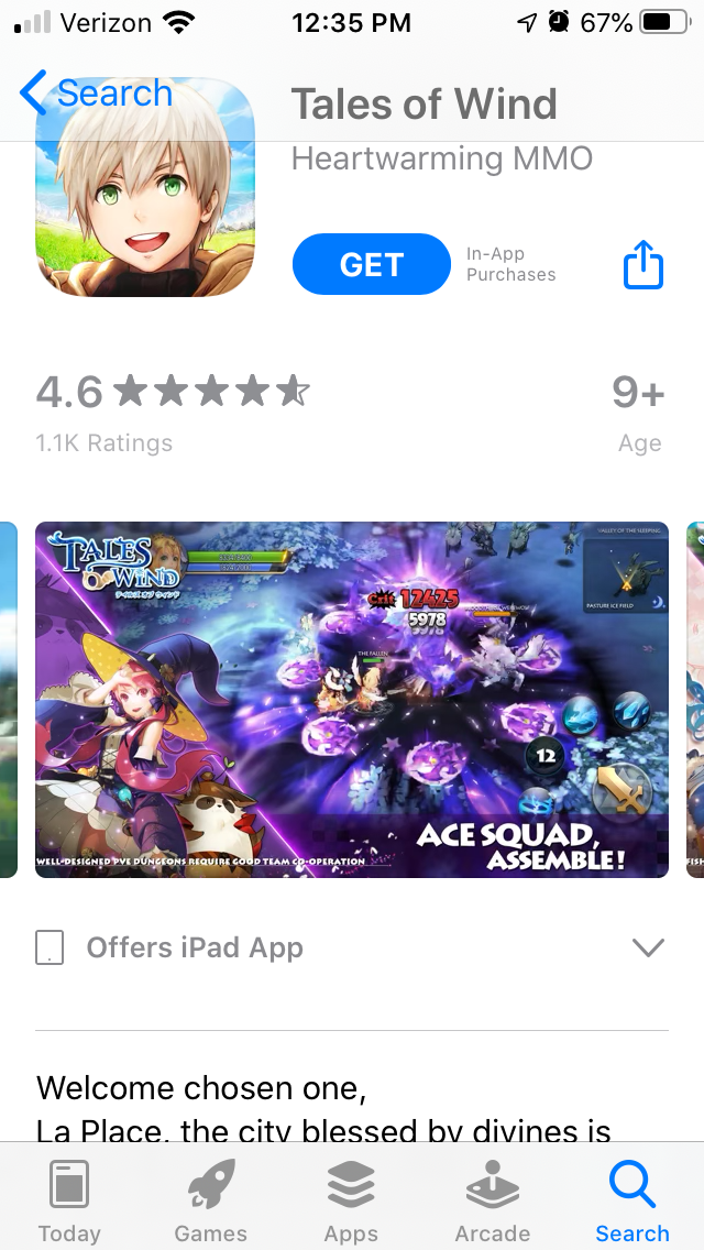 Like Genshin Impact, Tales of Wind uses a design for its screenshots that include characters and value propositions. Tales of Wind does not use as large a frame, but it has a clear cut through each image to place the characters and copy in.