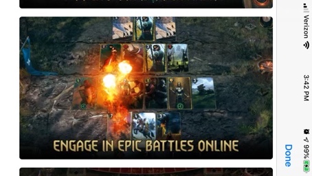 Gwent’s creative set starts off with a video. It uses intense music from the game to accompany clips of card battles, blending cinematic animation with the gameplay to show off the visuals and the card game aspect. It follows Apple’s video guidelines and uses in-app footage only while clocking in at just under 30 seconds.