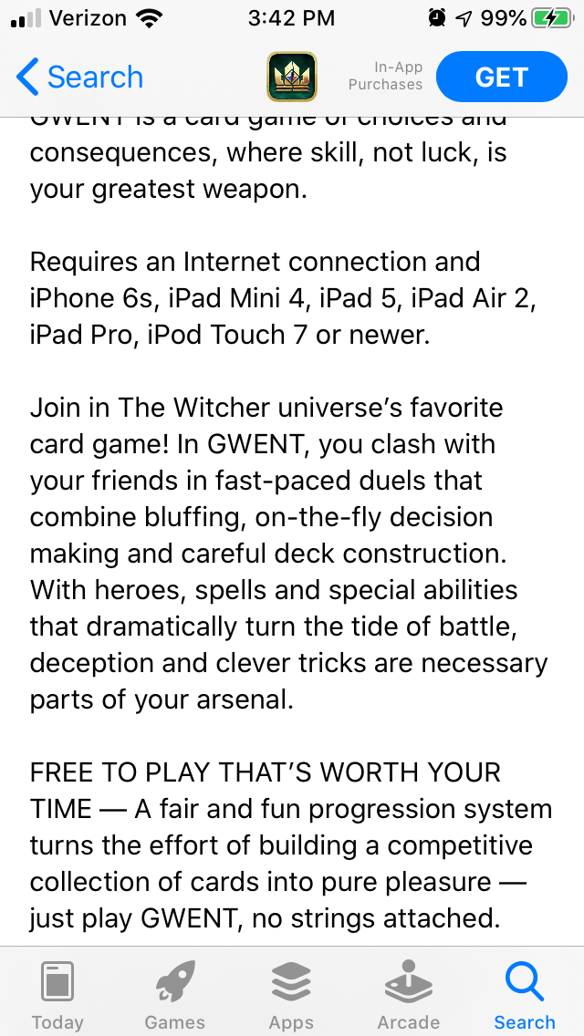 Gwent’s description starts off with promotional text describing the app as “a card game of choices and consequences.” This quickly conveys the purpose of the game.