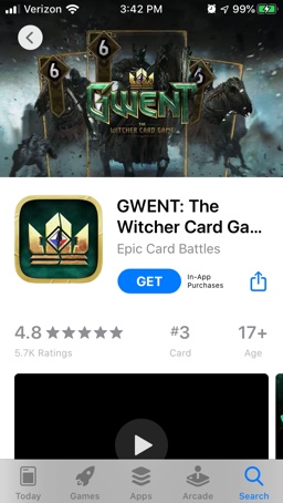 Gwent is already off to a very solid start, ranking at #3 in the Card category (right behind UNO and Solitaire). In searches, it ranks #1 for its name, as well as “The Witcher” and “Witcher 3.” It ranks #2 for “CCG,” although its rankings then begin to fall. It ranks #11 for “card battles” and #15 for “Gwent card game.” Its rankings then fall to #70 for “card apps” and #78 for “CCG Games.” The app is very new, so it still has room to grow.