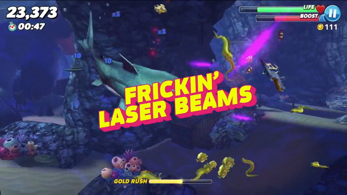 The third video also highlights several sharks, as well as a variety of power-ups, such as jet packs and laser beams. The text on the screen describes the latter as “frickin’ laser beams,” referencing the “Austin Powers” movie. The music is the same as the second video, continuing to set a fun and funny mood.