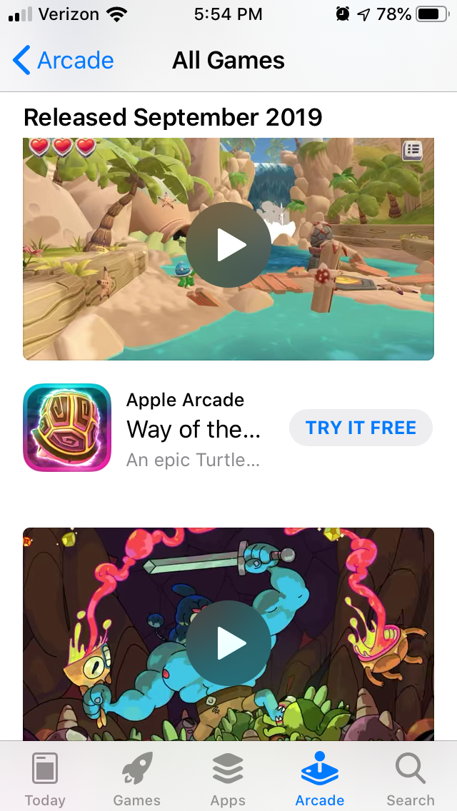 Users can access Apple Arcade games from the App Store by tapping the Arcade tab. Users are offered one free month upon updating. From the Arcade tab, users can scroll through the games available. This displays the app’s icon, title, and promotional video. At the moment, it appears that all Arcade games include videos, although they still include screenshots on the app page.