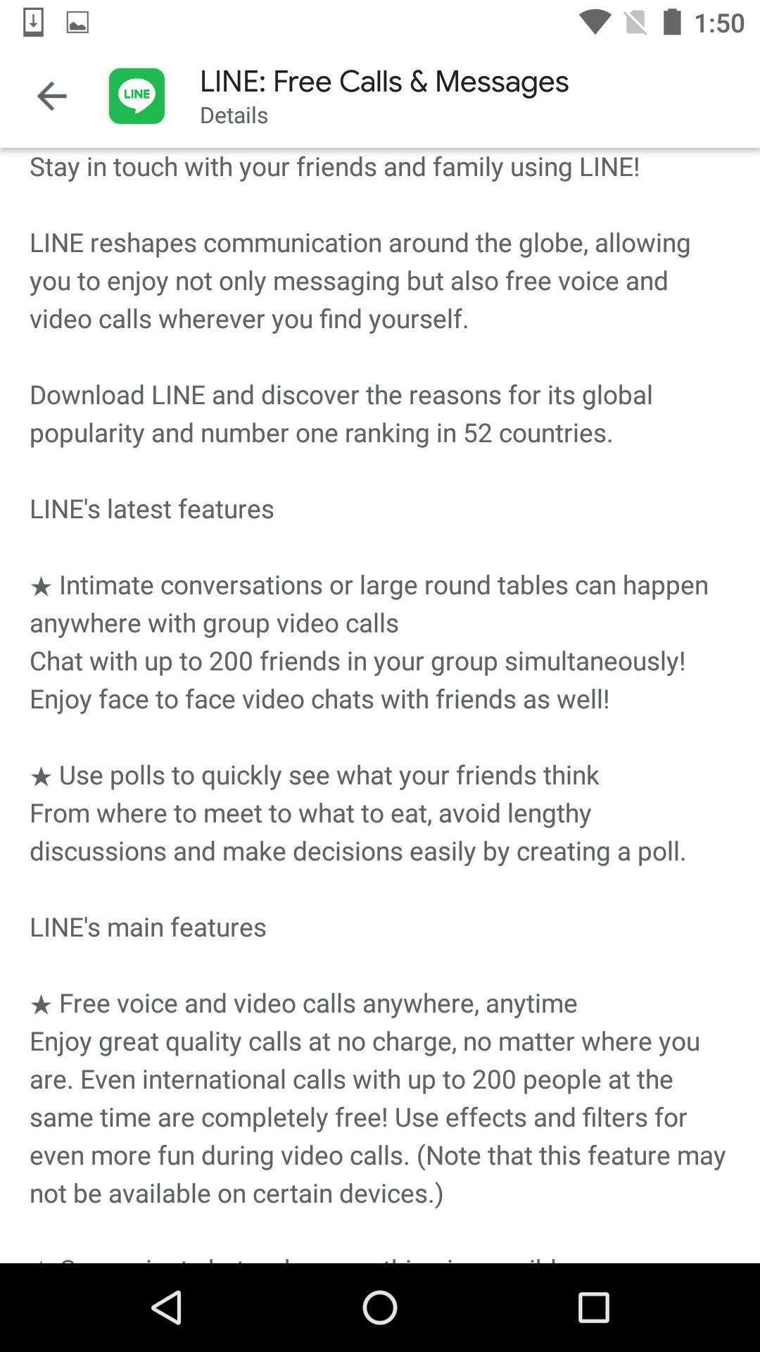 On Google Play, descriptions need to utilize keywords in order to index for them. One area where LINE could improve its description is in keyword placement.