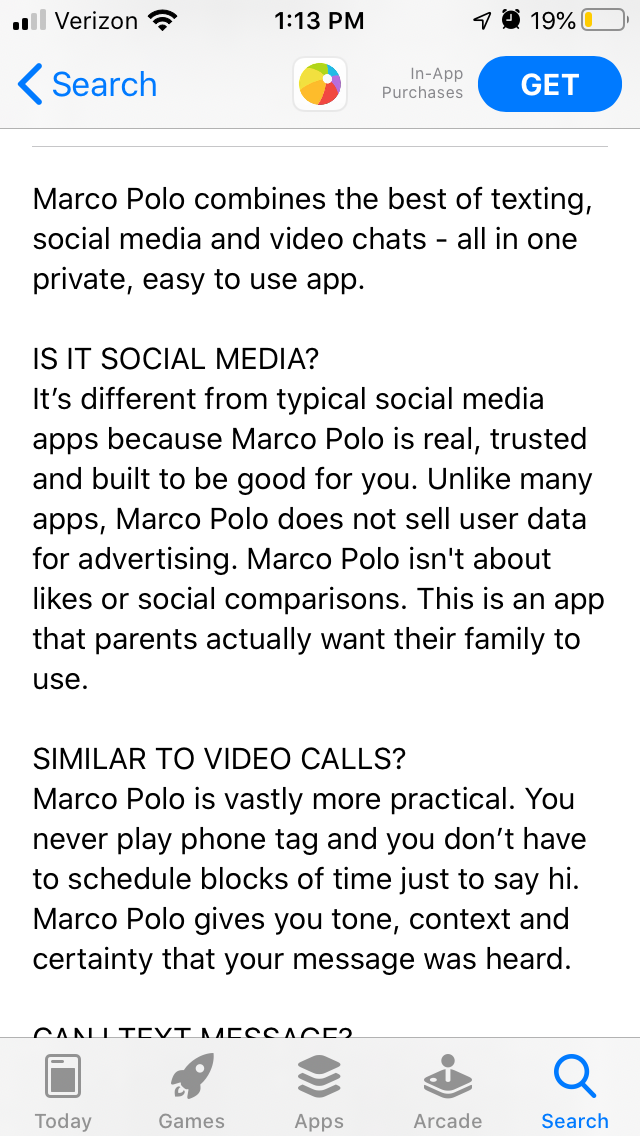 On the Apple App Store, Marco Polo’s description begins with a clear value proposition. In one line, it states the purpose and benefits of the app. This is a good introduction, as it’s concise and easy to read on an iPhone device while stating what the app provides users.