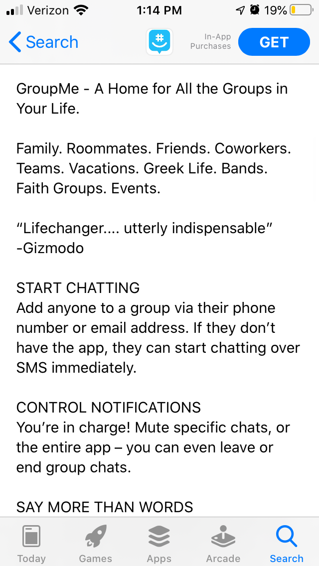 For instance, GroupMe on the Apple App Store also begins with a short value proposition, but it expands on the introduction in the second paragraph. It also uses feature sets, but each line is shorter than Marco Polo’s making it easier to read at a glance.