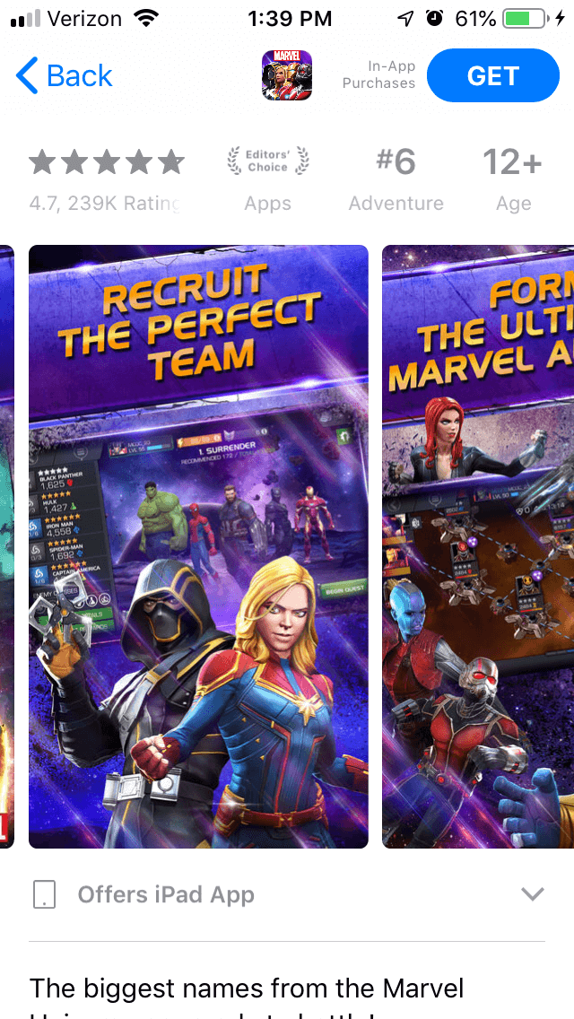 Marvel has also been advertising Contest of Champions in its comics and online, so fans of the franchise will know to look for it. While marketing in multiple channels is good, if it wants to improve its organic rankings and visibility, App Store Optimization is essential.