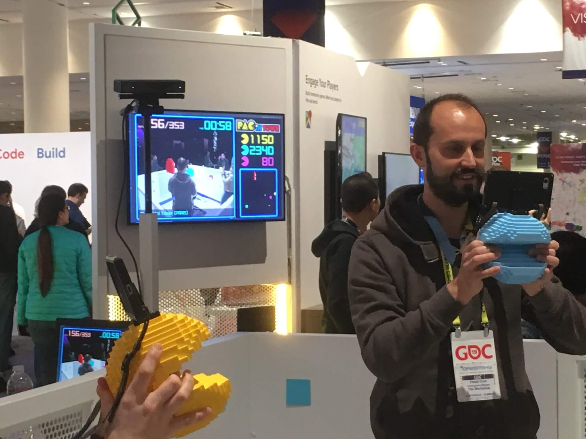 At Google’s booth, for instance, attendees could play a real-life game of Pac-Man. Two to three players were placed in an area and given phones mounted on controllers shaped like Pac-Man, where they could then use the AR camera to look around for pellets to collect and avoid oncoming ghosts. What made this interesting was the multiplayer experience – the games shared information with a server, which synced up where the ghosts and pellets were located with the playing and a map screen. Players moving within the game space saw the borders, pellets and ghosts, while onlookers could see how they were progressing from a different vantage point. If a player got killed by a ghost, they could respawn by high-fiving the technician.