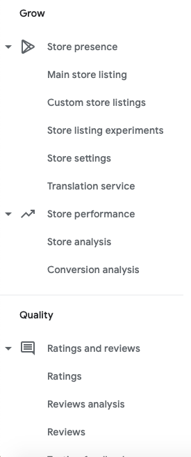 From the app dashboard, the left-hand menu includes sections titled “Release,” “Grow,” “Quality” and “Monetize.” These include important management tools for app development, including store listing management, analysis and experiments.