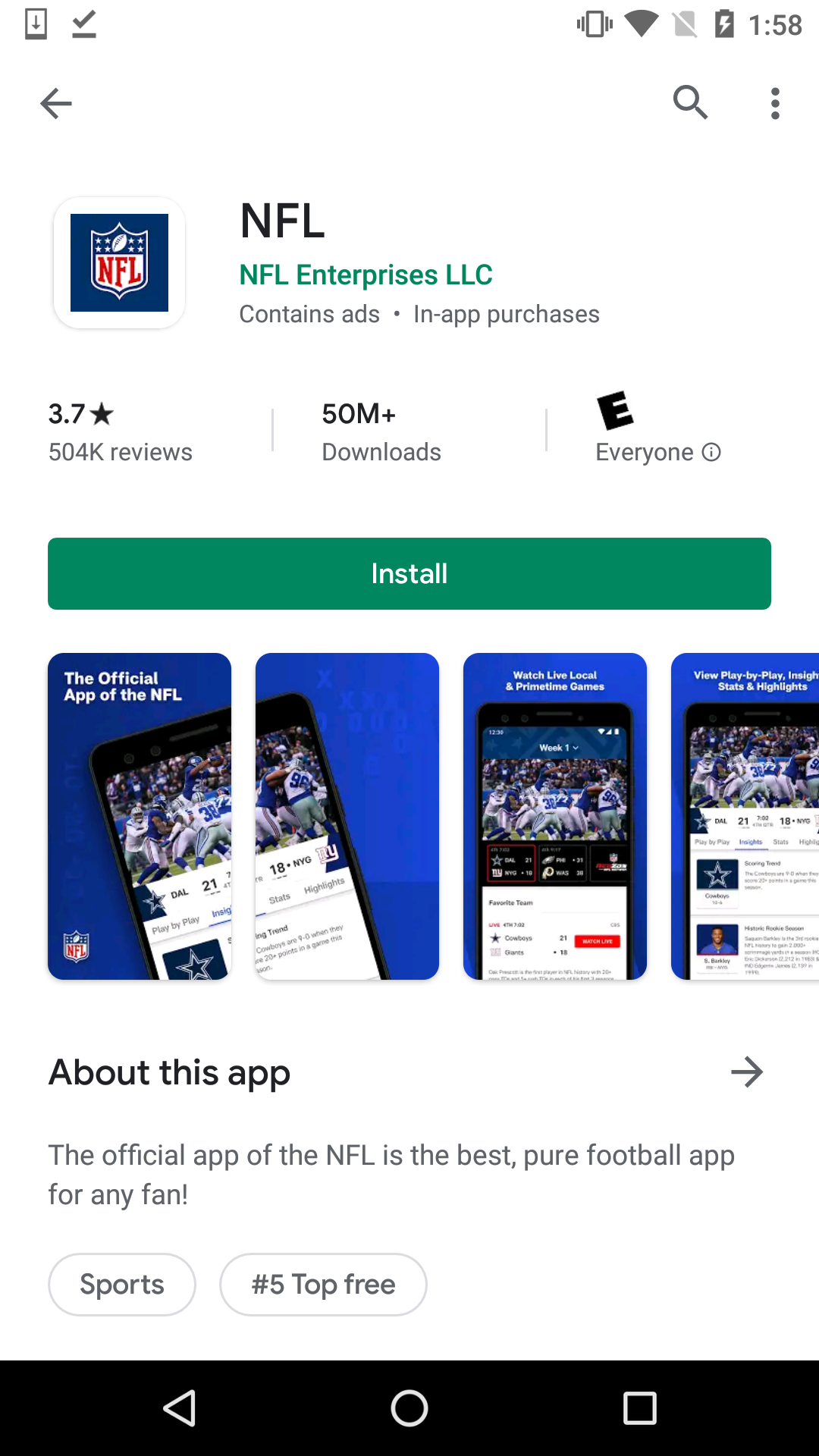 On the Google Play Store, the NFL app uses all eight allowed screenshots. These App Store Screenshots also use an image that matches across two screenshots early on. It does not include a screenshot calling out the Super Bowl, which is a missed opportunity for seasonality on the Google Play Store.