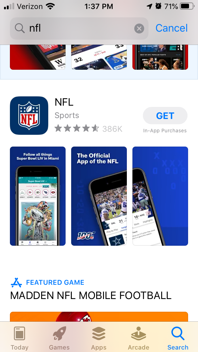 The remaining screenshots are less Super Bowl focused and discuss more general features. The screenshots show how users can watch live games, see highlights, read football news and so forth. It does reiterate the Highlights feature, mentioning it once with “View Play-by-Play, Insights, Stats & Highlights” and again with “Watch Highlights for Every Game.”