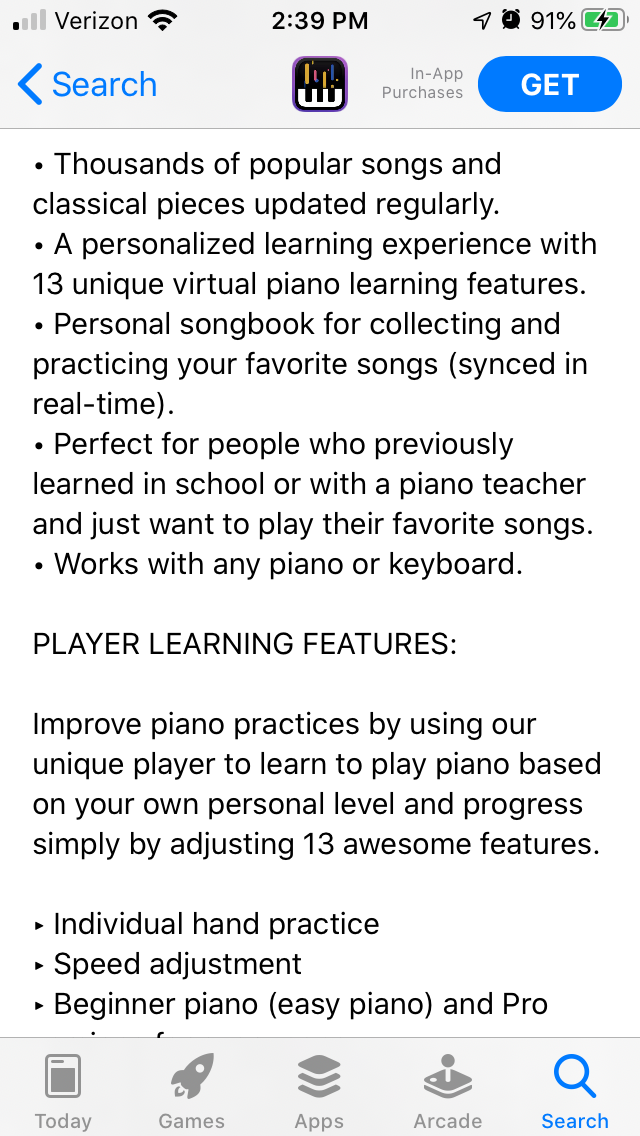 On the Apple AppStore, OnlinePianist begins with a single sentence introductory line. The rest of the introduction is also short, before it moves into feature sets for the app’s main features and “Player Learning Features.”