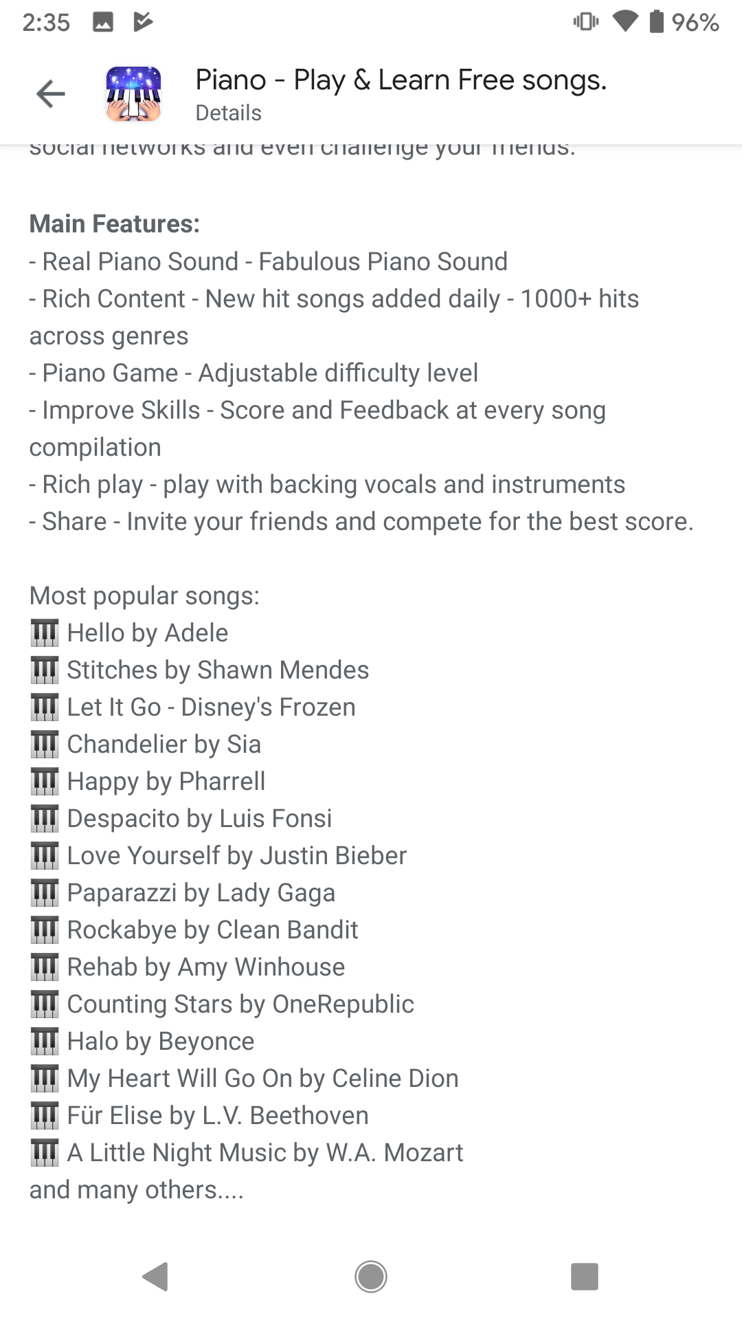 Piano Academy uses an identical description on the Google Play Store. As with the Apple App Store, it could be reformatted to present the information in order and include a longer feature set. This would also present an opportunity to adjust the description for keyword optimization.