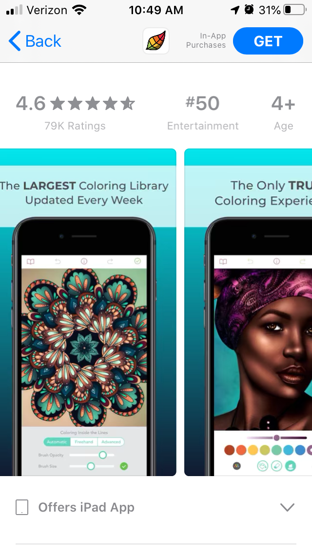 As an adult coloring book app, Pigment relies on its visual elements to drive downloads. The screenshots need to showcase the designs, picture options, color ranges and so forth to show users why they should download it. At the same time, screenshots should include bold callout text that describes the features and benefits. This quickly informs users of what the app provides as they look over the page