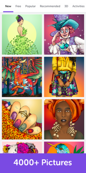 On Google Play, the Recolor app also focuses on showcasing the artwork users can create, but it provides more variety in the style of the images. For instance, in the screenshot presenting the “4000+ pictures” value, it uses a screenshot from the menu to show a wide selection of picture options. Recolor’s callout text is on the bottom of each screenshot, but each value is 2-3 words long and stands out with large white text.