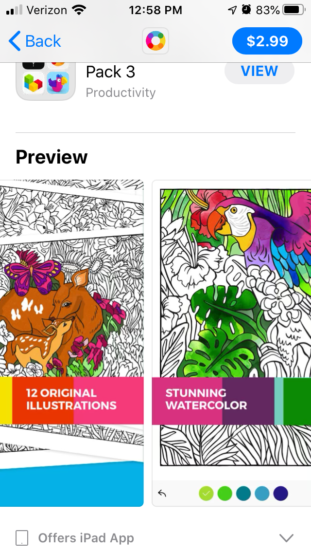 On the Apple App Store, Taiyasui Color uses the colors for its screenshots differently. As it’s a coloring book app, it shows each page in the process of being colored, rather than the completed image. This makes each colored section pop off the page more, like a bright parrot in a field of white. The callout text is placed closer to the middle of the screen on a multi-colored line, and no line of text is more than four words long.