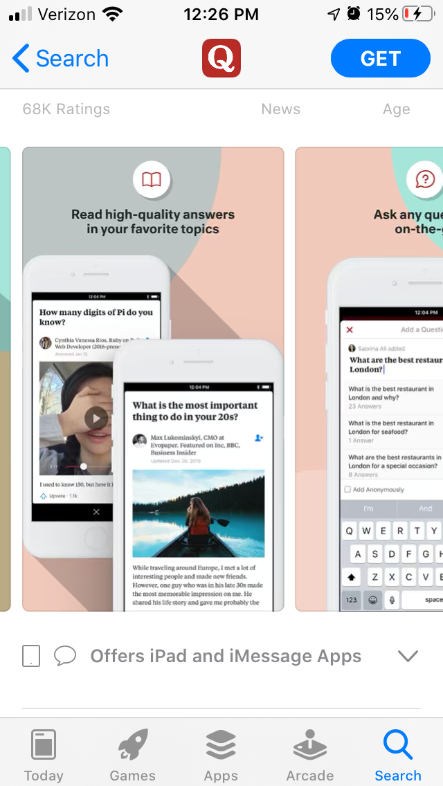 Apps that are primarily text-focused can have difficulty creating engaging app store screenshots. Quora works around this by using screenshots including responses with pictures in them. This adds extra visual elements than just the layout and text to make the screenshots stand out better.