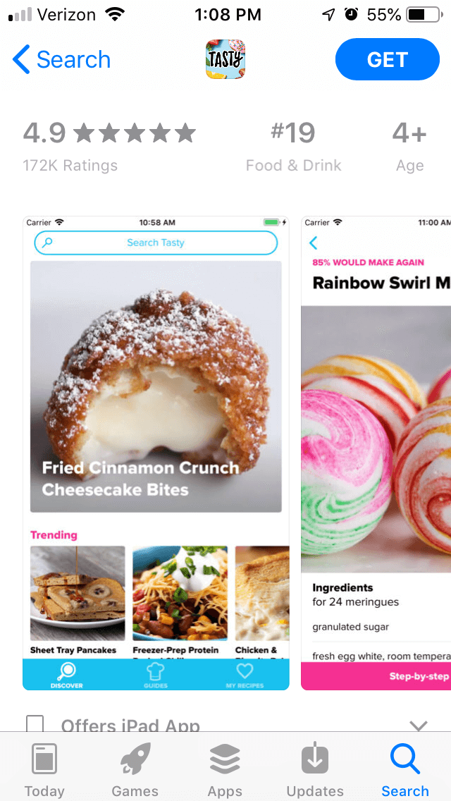 On the Apple App Store, Tasty is the #19th highest app in the “Food & Drink” category, with an impressive average rating of 4.9 stars. It’s the first app in search results for a number of high-volume cooking terms, including “baking,” “dinner recipes,” “easy recipes,” “food app” and “cooking app.” It’s also in the top 10 for a number of restaurants and food delivery apps, such as “subway” (#2) and “Panera” (#6). Its rankings don’t begin to drop until it reaches terms like “salad recipes” (#21), “vegan food” (#33) and “healthy diet” (#36). Creatives: Tasty’s choice of creatives showcases multiple colorful, sugary sweets, such as “fried cinnamon crunch cheesecake bites” and “rainbow swirl meringues.” These immediately invoke a mouth-watering reaction from users while remaining easy on the eyes. Those pictures are part of screenshots showing the various features, such as the home screen, recipes and cook books, so they help demonstrate what the app has to offer while presenting plenty of food imagery.