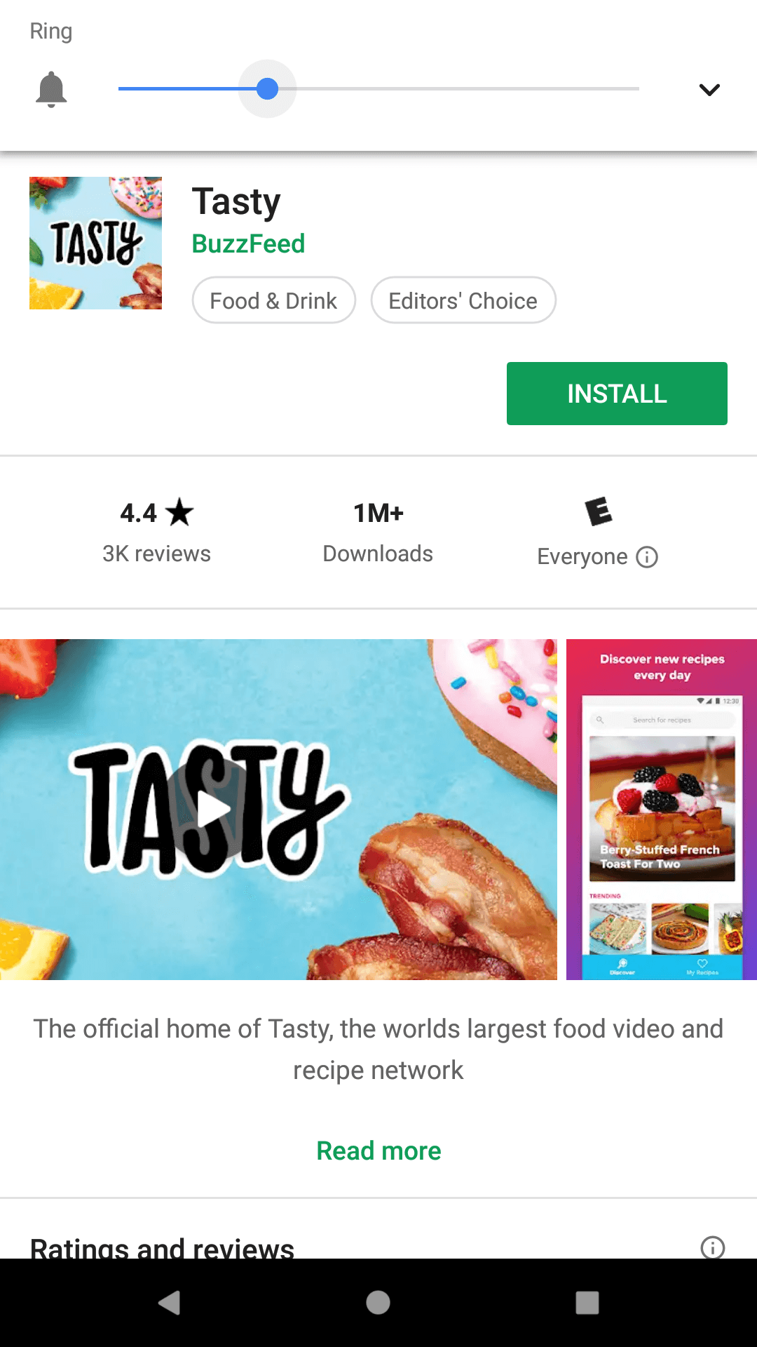 On Google Play, Tasty is the top-ranked app for “how to cook,” but that is the only keyword it takes the #1 spot for. It’s still ranked #3 for important keywords like “cooking apps,” “recipe apps” and “food recipes,” but its rankings begin to fall for keywords like “recipes cookbook” (#11), “recipe builder” (#25) and “healthy food recipes” (#47). Whereas the iOS app ranked high for restaurant and food delivery keywords, the Google Play version ranks #16 for “panera” at best. Creatives: The Google Play page begins with a video showing the app in action, with instructions on how it’s used and what it has to offer. It’s a short video that demonstrates how the app is used while showing recipes and cooking videos in action.