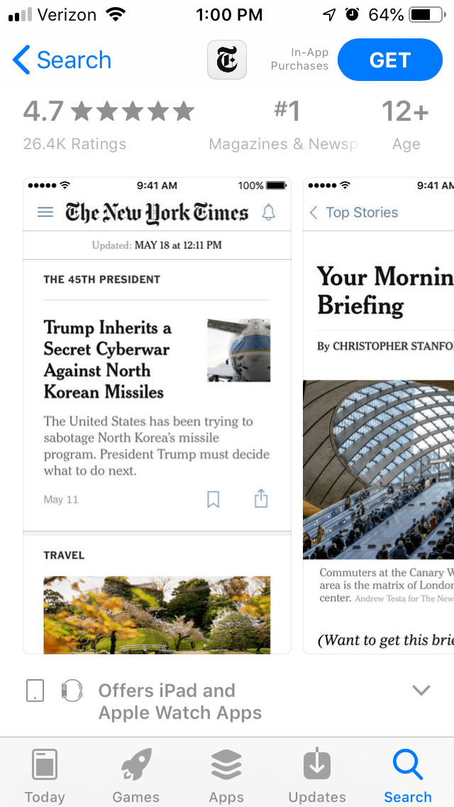 On the Apple App Store, The New York Times is the #1 app in the “Magazines & Newspapers” category. It’s the top app in searches for its name and variants thereof, as well as “newspaper,” “nyt now” and “the daily.” It also ranks as the second-highest app in searches for “international news,” third-highest for “daily world news” and “national news,” and seventh for “journalism.” Its ratings get lower for other competing news sources, such as “CNN news app” (#22) and “apple news app” (#18) as well as terms like “breaking news” (#19) and “smart news” (#20).