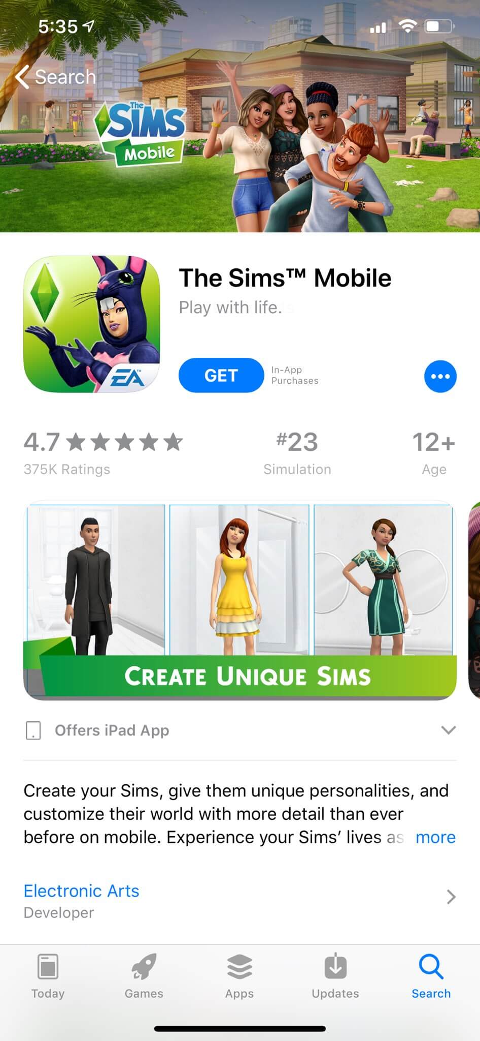 On the Apple App Store, The Sims Mobile is ranked #24 in the Simulation category. It’s the top-ranked app for many “Sims” searches, including “sims animals,” “sims ambitions” and “sims online.” It’s also in the top five results for “free simulation games,” “make a house,” “play with life” and “world games.” Additionally, the app ranks well for a number of competitor terms, such as “Avakin Life” (#11) and “Bitlife” (#12).