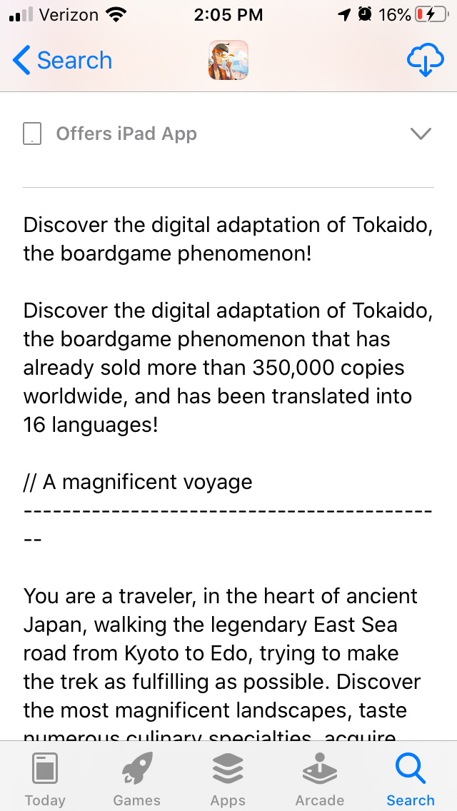 The App Description can delve into an app’s features and details, draw users in with promises of exciting gameplay and highlight what users and critics think. For today’s App Store Spotlight, we look at the description for Tokaido, a mobile app based on a popular board game. The game developers recently made it free to download, so how can they use the description to highlight its value and bring in new users?