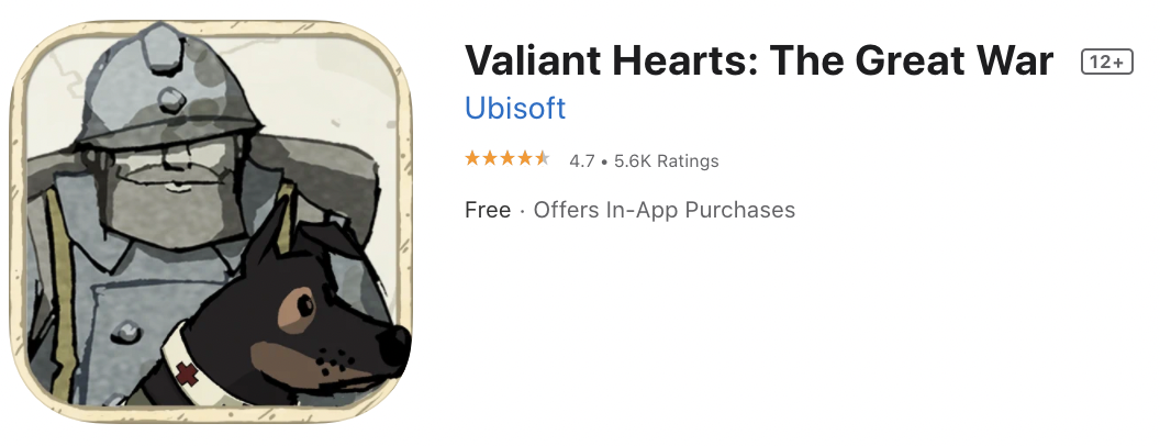 Currently, Valiant Hearts: The Great War is not ranked in the top 200 of either of its established categories in the App Store (Games: Adventure and Games: Puzzle). While it’s not discoverable in its category list, it does rank for over 500 keywords in search results, with slightly under half of those ranking in positions above #50. Below we take a look at the metadata and creative components used and see what’s working well and where there is room for improvement to grow these rankings even further, to maintain and increase discoverability even after the Today Tab feature ends.