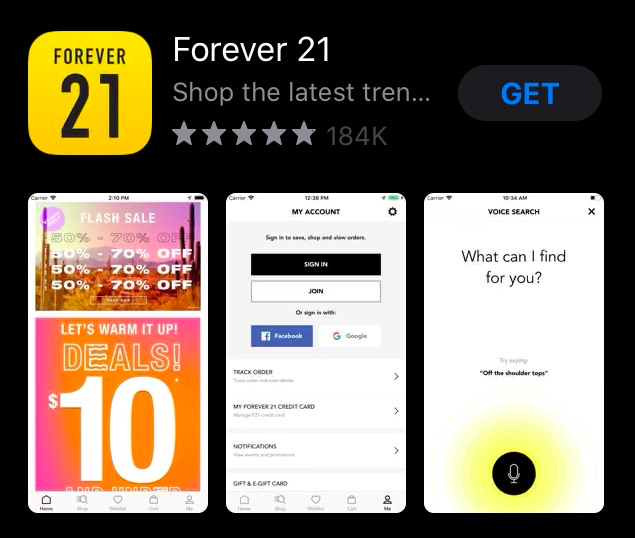 The Forever 21 app’s screenshots on the Apple App Store are not organized by features or value. Although the first screenshot advertises a sale, the second one is a picture of the “My Account” page, and the third is its voice search. As these are the screenshots that appear alongside the app when it appears in search results, they should showcase the biggest selling points.