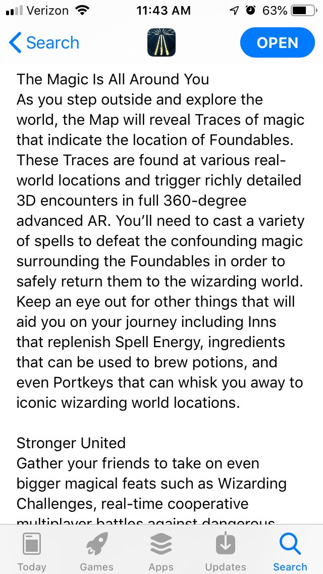 Description: The description for Wizards Unite provides a lot of information, but it’s presented in large paragraphs. When viewed on an iPhone, a single section takes up nearly the entire screen, making it hard to take in at a glance. Users scrolling through will skip most of the paragraphs and only gain a little information from them.